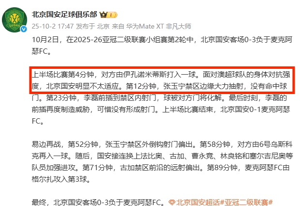 赛后,国安官方发布的战报中对丢球的原因进行了讲解:靠近澳超球队的体魄扞拒强度,球队较着不太合乎。