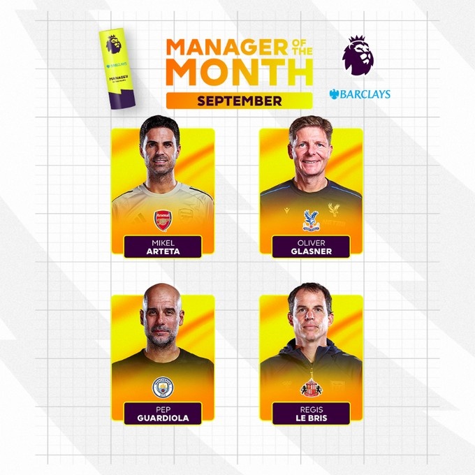 10月2日讯 英超公布9月份最好教学候选名单,阿尔特塔、格拉斯纳、瓜迪奥拉和勒-布里斯入围。