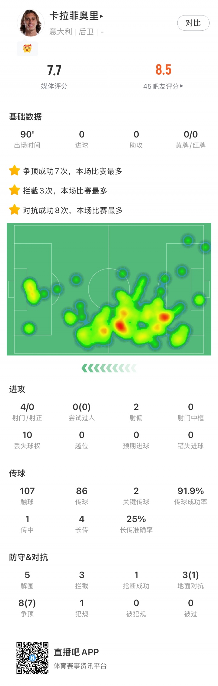 新一代万能意大利左中卫——卡拉菲奥里本轮世初赛数据: