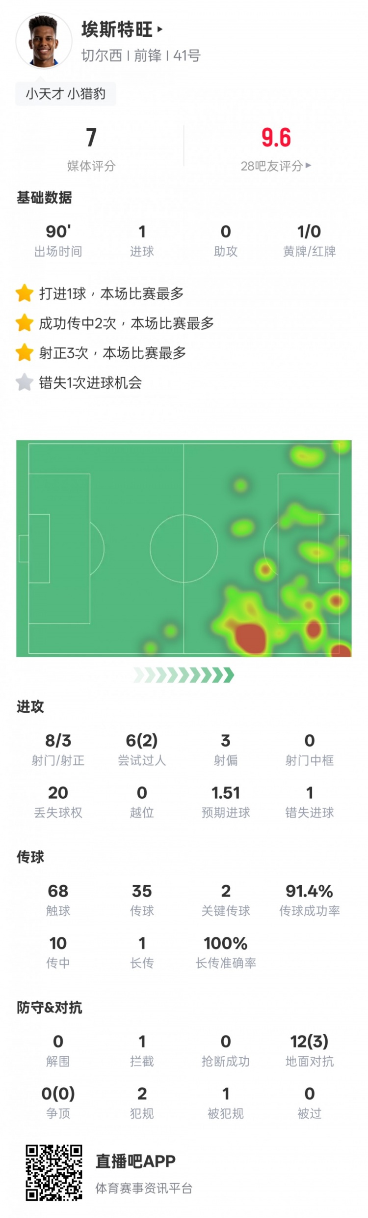 10月23日讯 欧冠联赛阶段第3轮,切尔西5-1大捷阿贾克斯。埃斯特旺首发出战,孝顺1粒进球,送出2次关节传球,但也错失1次进球契机,评分7.0。
