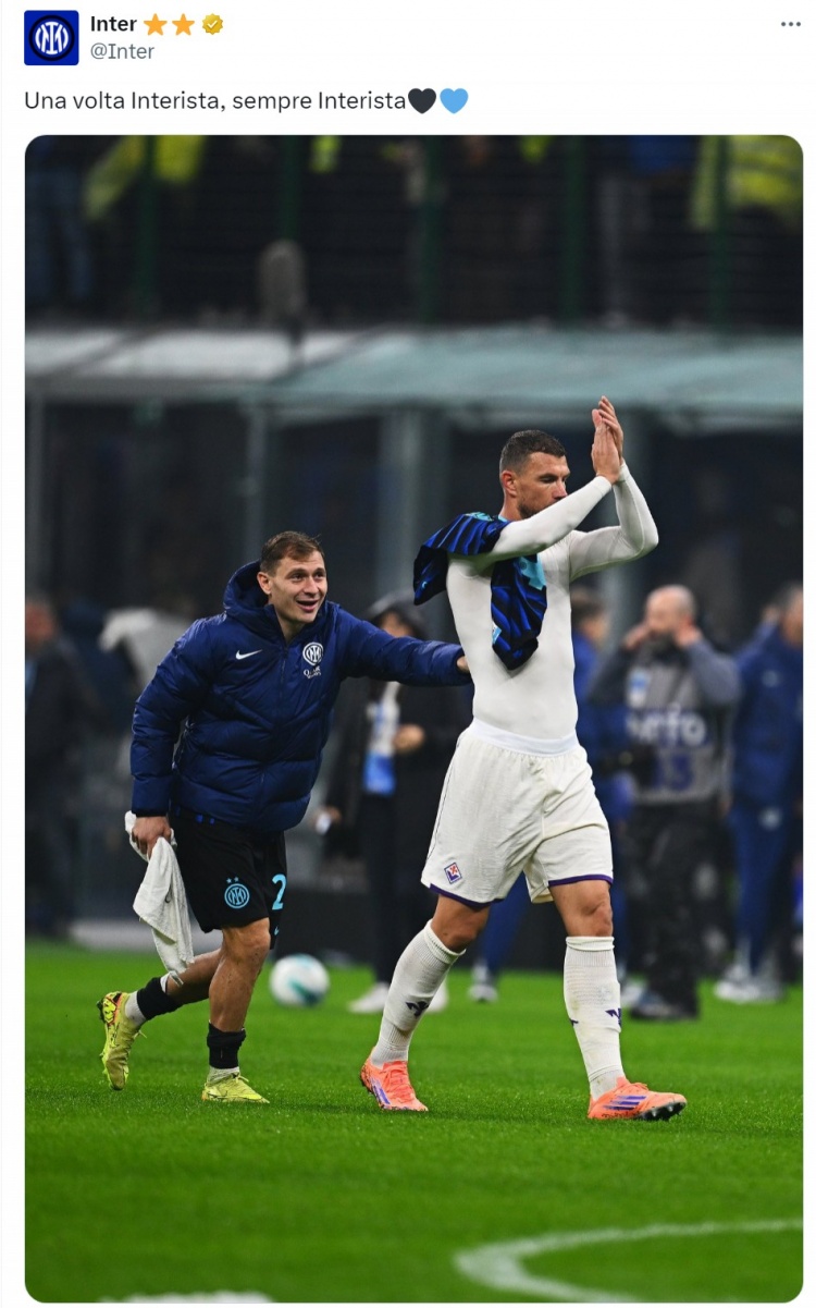 国米旧将哲科此役为佛罗伦萨替补出场,国米官方社媒晒出哲科的像片,请安这位39岁的前卫,配文:“一日蓝黑,毕生蓝黑。”