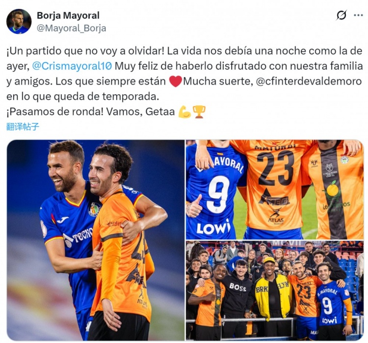 10月30日讯 赫塔费前卫马约拉尔更新社媒动态,晒出与哥哥同场竞技的相片。