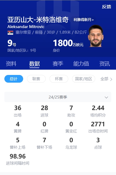 米特洛维奇现年30岁,上赛季代表利雅得月牙出场36场,打进28球。