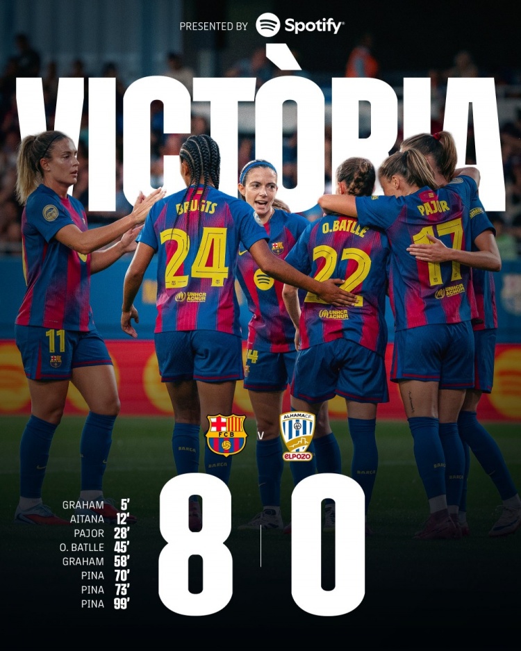 本场比赛中,巴萨女足有3东说念主:洛佩斯、帕约尔和邦马蒂完成梅开二度,中场吉哈罗更是献技了中场吊射破门的好戏。