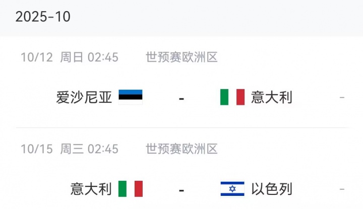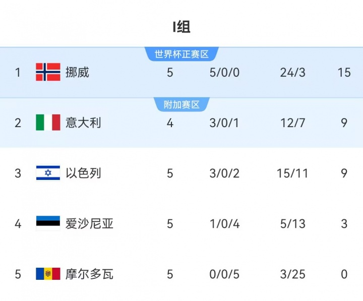 意大利现在的世初赛出线场面并不乐不雅:他们少赛一场落伍小组排行第1的挪威6分。10月12日,他们将客场挑战爱沙尼亚;10月15日,他们将主场迎战以色列。