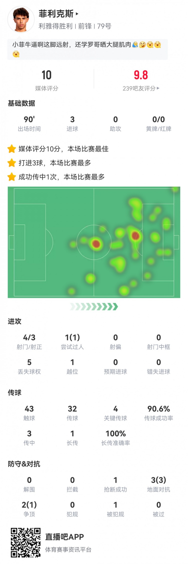 10月19日讯 本轮沙特联,利雅得告捷5-1哈萨驯服。此役菲利克斯首发打满全场,球员全场重心数据如下↓