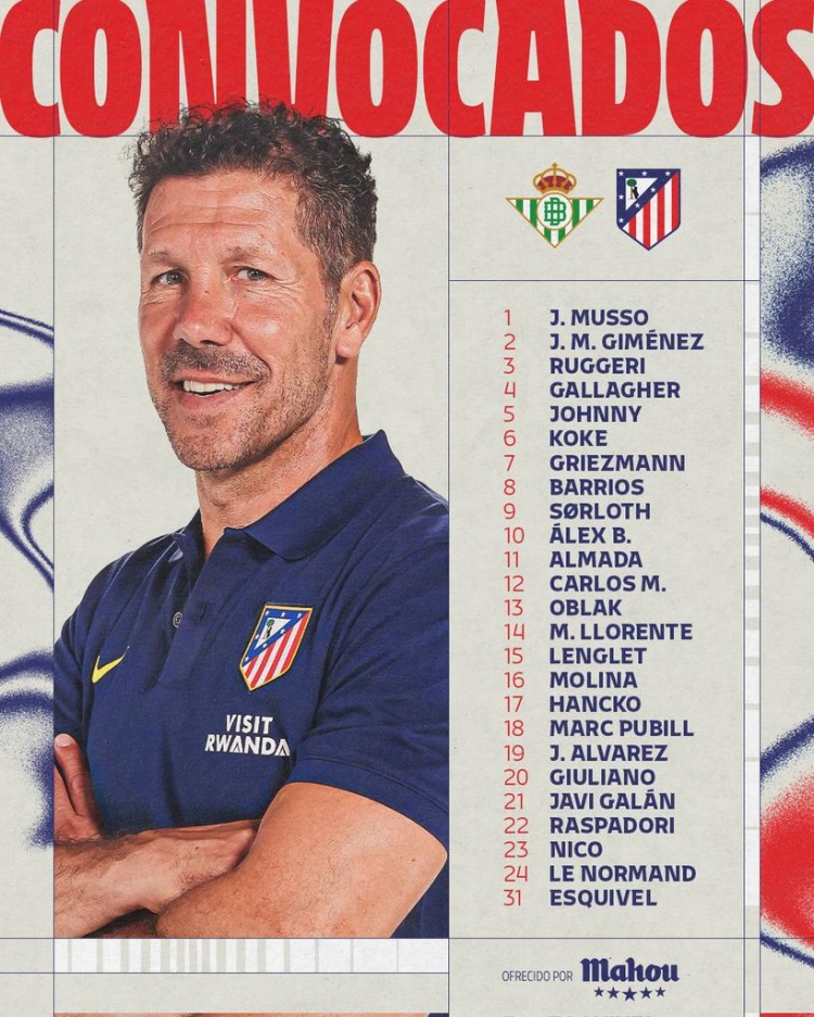 先锋:7-格列兹曼、9-瑟尔洛特、11-阿尔马达、19-阿尔瓦雷斯、20-朱利亚诺-西蒙尼、22-拉斯帕多里、23-尼古拉斯-冈萨雷斯
