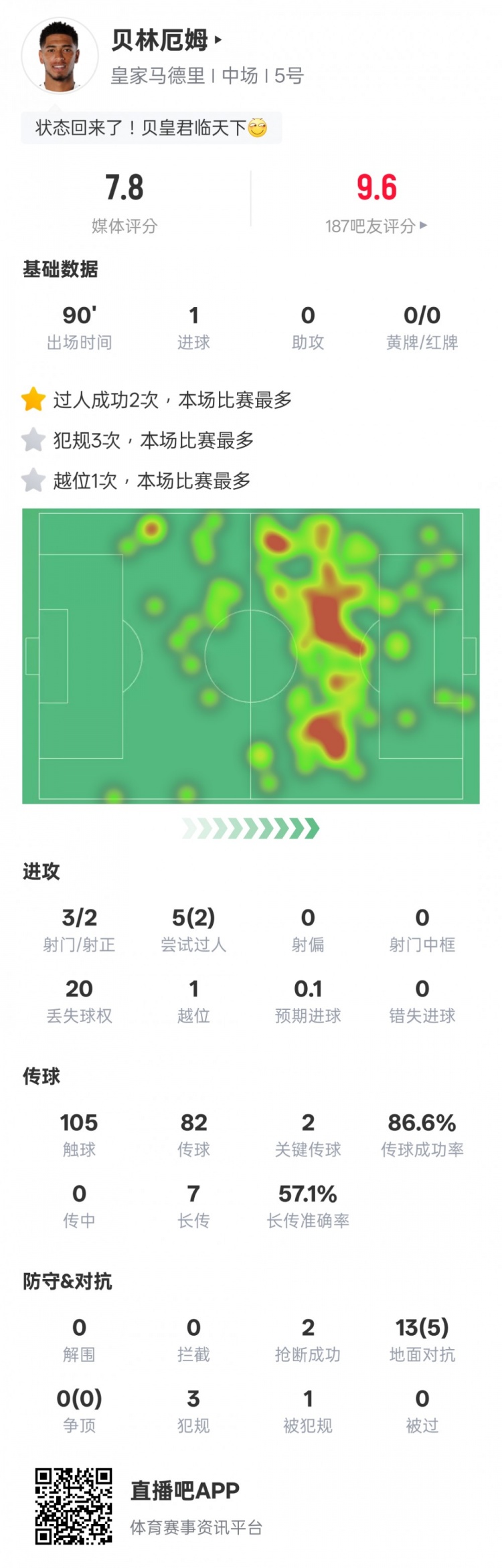 11月2日讯 2025-26赛季西甲第11轮,皇马4-0瓦伦西亚。贝林厄姆首发出战,打进1粒进球,送出2次舛误传球,还有2次过东说念主得手和2次抢断,评分7.8。