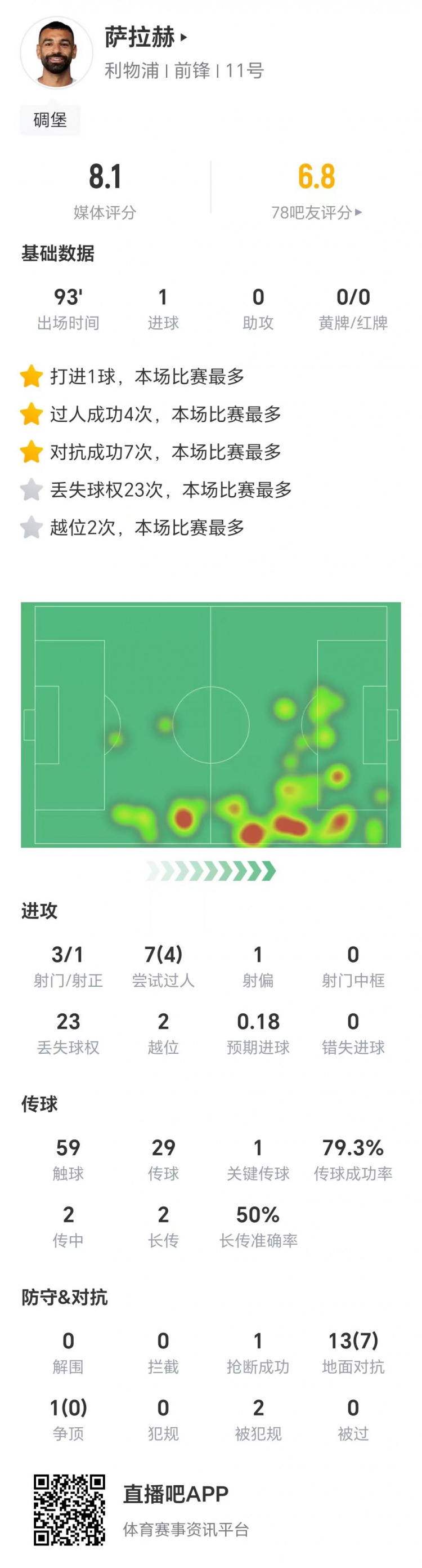 赛后时间统计数据泄漏,萨拉赫本场比赛3射1正,7次过东说念主4次收效,23次丢失球权,1次要道传球,13次大地挣扎收效7次,获评8.1分。