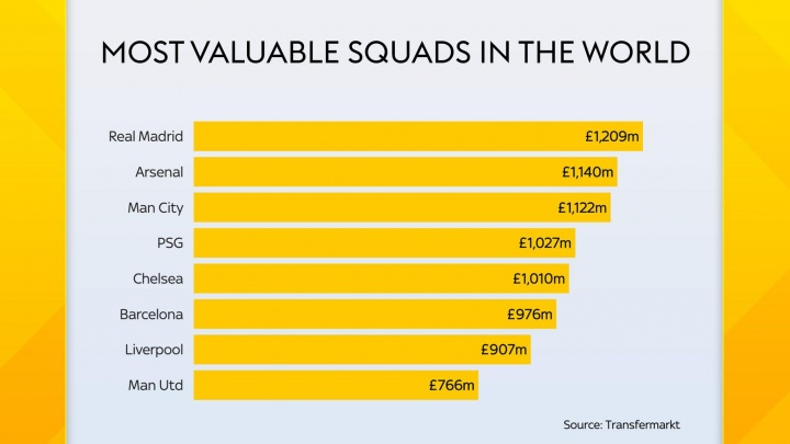 08月23日讯 英国太空体育征引德转数据,列出了公共俱乐部球员总身价排行,皇马以超12亿镑的身价位居首位。