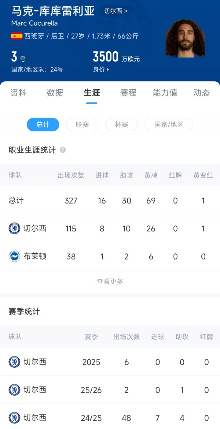 27岁的西班牙后卫库库雷利亚,2022年以6350万欧元的转会费从布莱顿加盟切尔西,于今已代表切尔西出战115场比赛,孝敬8粒进球和10次助攻。库库雷利亚与切尔西本来的左券将在2028年6月到期。