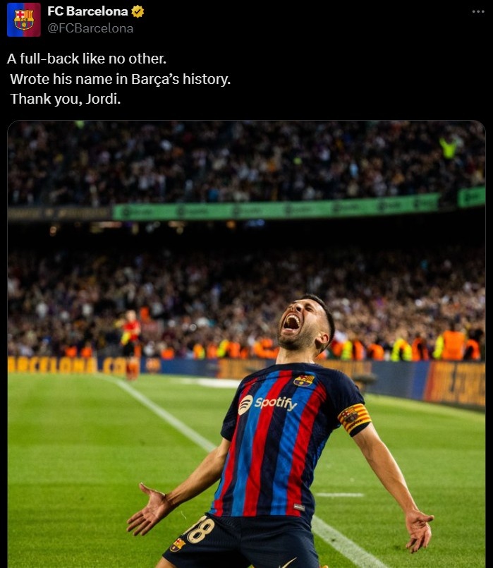 巴萨官方写谈:“一位不同凡响的边后卫。在巴萨历史上留住了我方的名字。谢谢你,乔迪。”