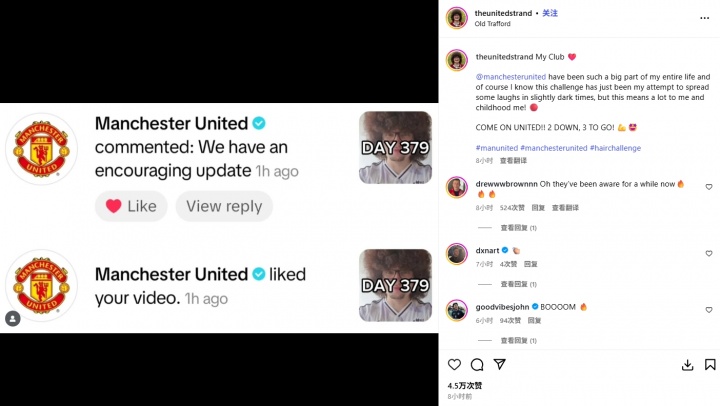 10月20日讯 本轮英超曼联2-1打败利物浦,获取两连胜。赛后着名曼联球迷“蓄发哥”发布社媒晒出截图,从图中不错看到,曼联官方社媒点赞了他的视频,并评述谈:咱们有一个令东谈主饱读励的发达。