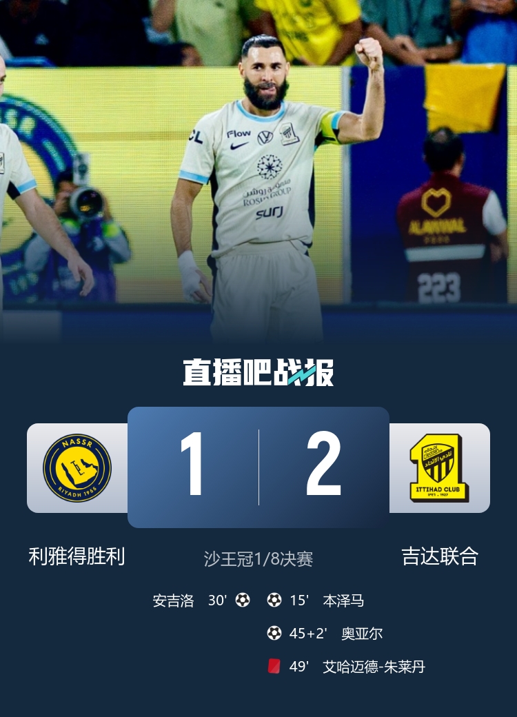 本泽马推射破门,奥亚尔抽射立功,最终利雅得得手1-2十东说念主吉达王人集无缘八强。