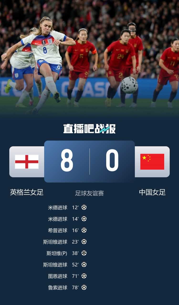 11月30日讯 友谊赛,中国女足0-8惨败英格兰女足。