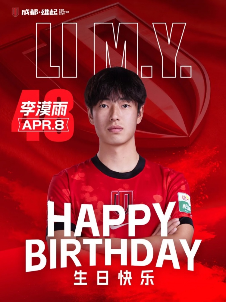 成都蓉城官方写道:李漠雨生日快乐💪💪💪边路之上你是蓬勃 满满的年少 利刃,快跑 之间你是冲破 防线的未来希望,控球如风,撕破对手防线,传中似箭,点亮门前场球员芒。今朝,愿你在蓉城赛场肆意成长,不负韶华,绽放属于你的光芒!