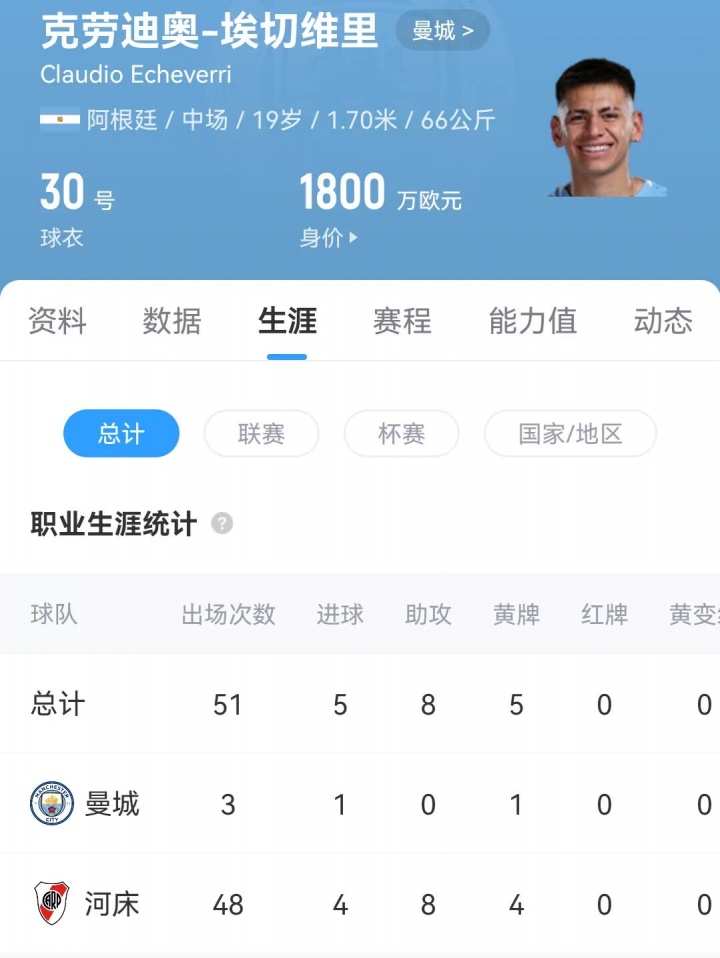 19岁的埃切维里冬窗认真加入曼城声势,当今仅为曼城出场过3次,孝顺1粒进球,现身价1800万欧。