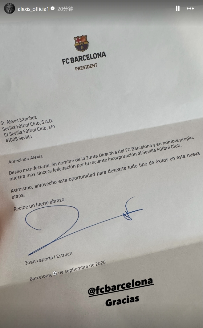 09月23日讯 36岁的智利时尚、巴萨旧将桑切斯今夏纪念西甲加盟塞维利亚。今天他更新社媒,展示了一封老东家巴萨发来的贺信。信中纰漏写谈: