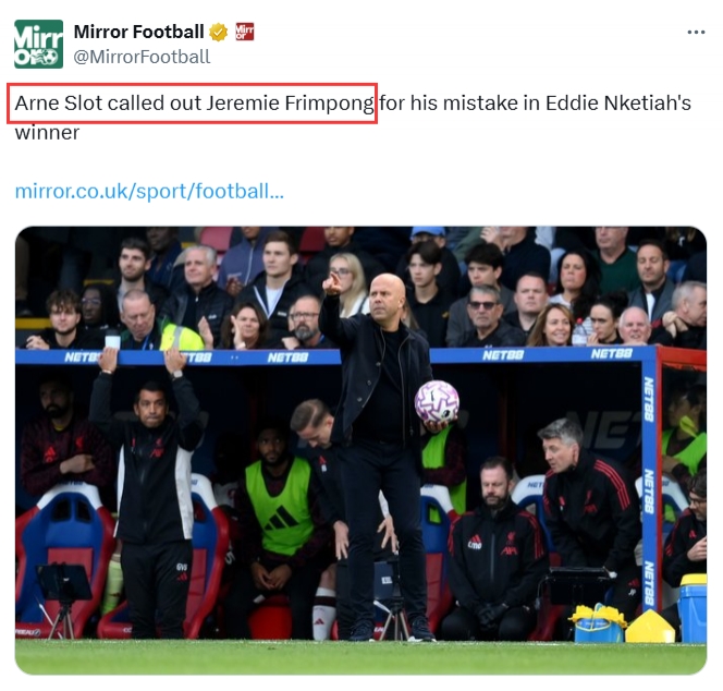 太空体育和《泰晤士报》均指出,斯洛特赛后驳斥的这名球员是弗林蓬,《利物浦回声报》也线路,斯洛特的这番言论默示的是弗林蓬在临了时代的看管特地。《镜报》也以“斯洛特公开驳斥弗林蓬”为题发布著述。
