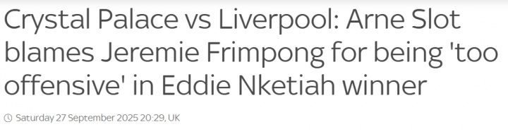 09月28日讯 本轮英超利物浦客场1-2遭水晶宫读秒绝杀,赛后利物浦主帅斯洛特驳斥队内某名球员高大空想太强导致球队失球,激发烧议。