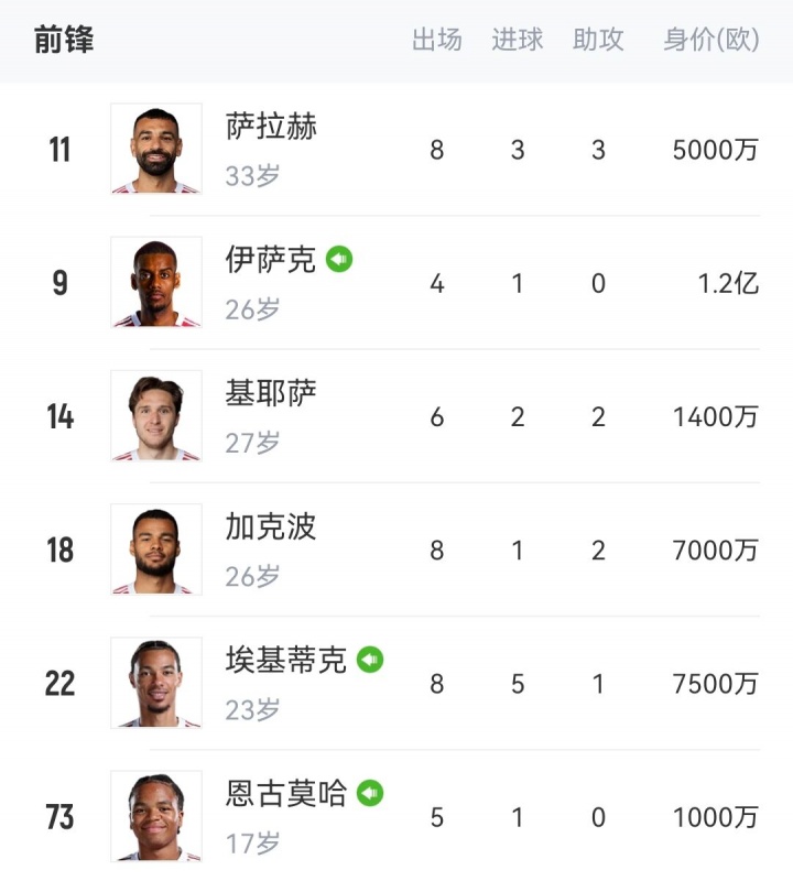 当今伊萨克和维尔茨两位“标王”的发挥当今齐还弗成让东说念主景况,萨拉赫跟着年齿的增长在控球冲破时也显牛逼不从心,而加克波则因单一的蹙迫时候遭到诟病。反倒是替补出战的基耶萨和恩古莫哈时往往会给球迷带来惊喜。