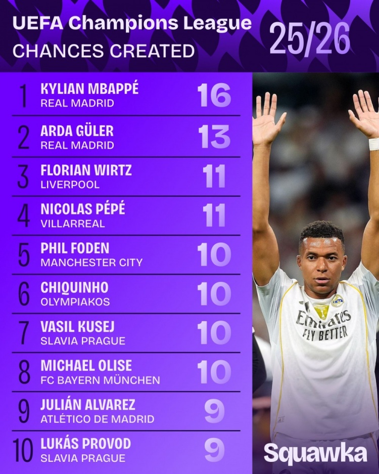 10月23日讯 本赛季欧冠联赛阶段已战罢3轮,Squawka统计了到当今结束的创造契机榜,姆巴佩16轮换一,居莱尔13轮换二。