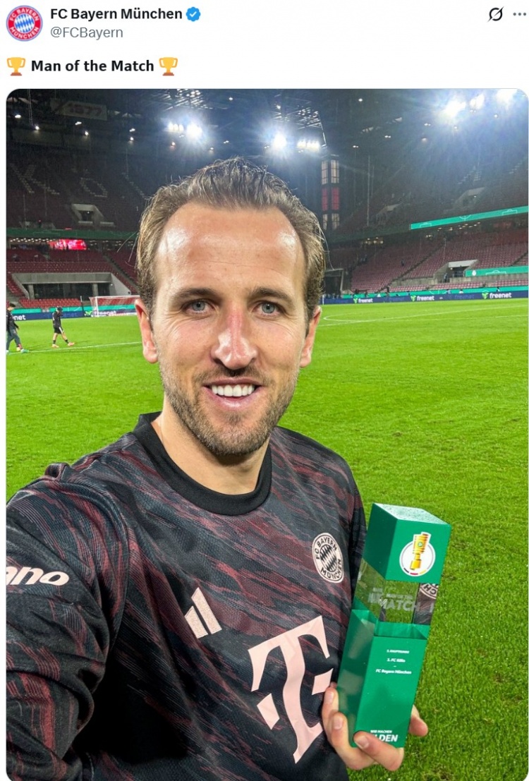 本场比赛凯恩梅开二度,赛后他也当选德国杯官方评比出的本场比赛最好球员。