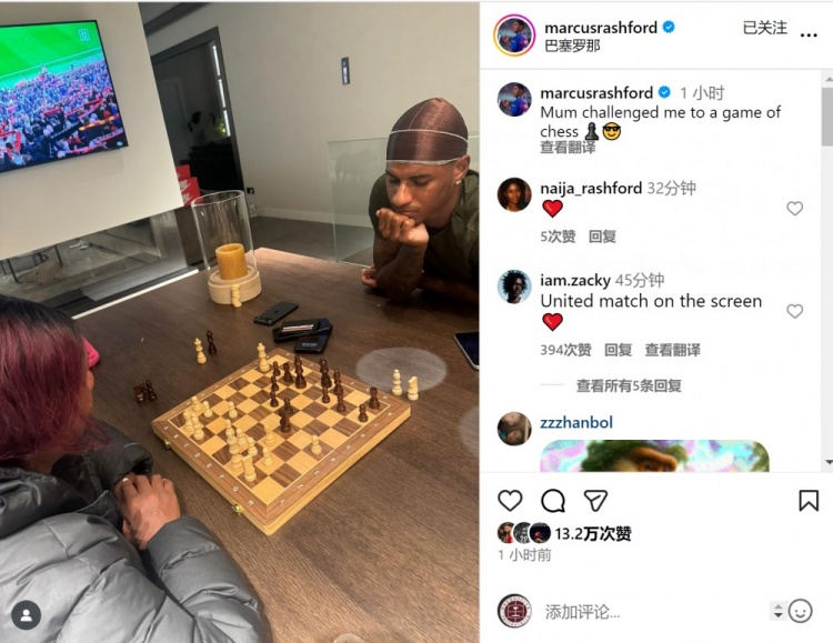 拉什福德社媒晒出对弈像片,配文:“姆妈向我发起了国外象棋挑战。”