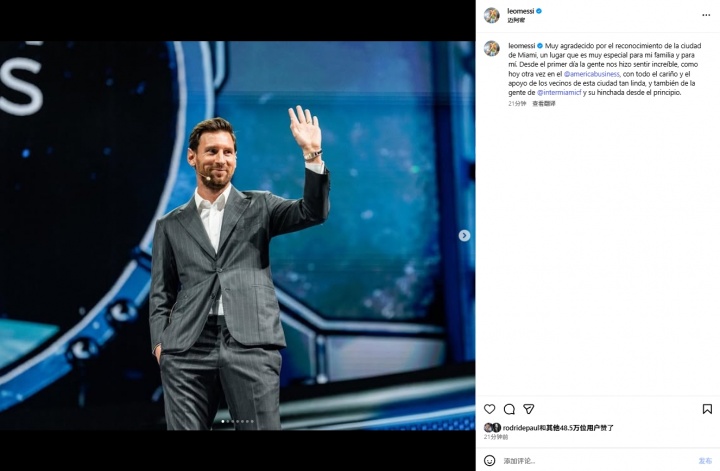 11月06日讯 本日梅西出席好意思洲贸易论坛,迈阿密市长给梅西颁发了迈阿密城市钥匙。梅西也发文谈到了迈阿密。