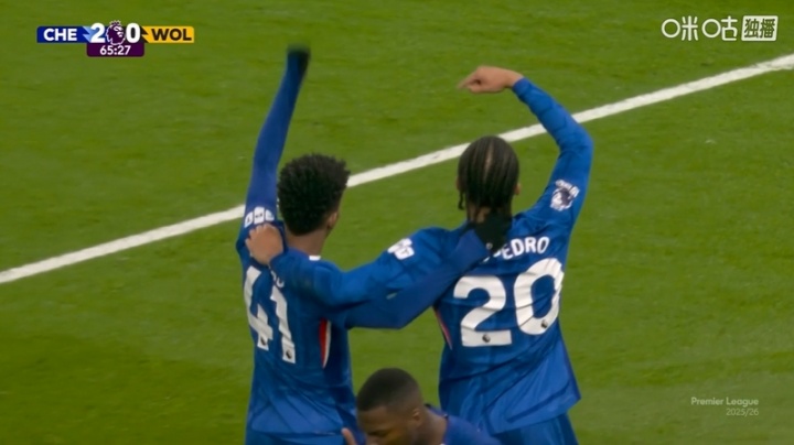英超第11轮,切尔西3-0狼队,两位巴西国脚佩德罗与埃斯特旺庆祝
