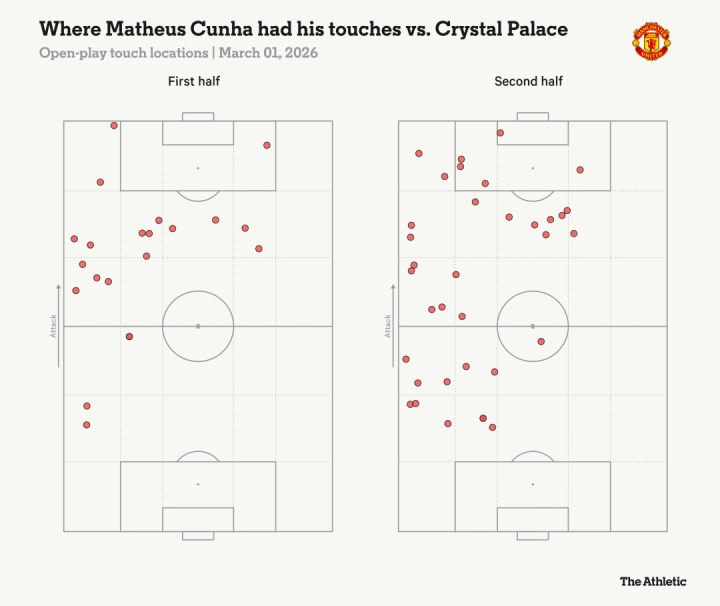 对纽卡斯尔的对决中,库尼亚试图再次这么踢。巴西国脚在90分钟内的触球分布,与对阵水晶宫的后半场间歇时间更加相似,在后撤和靠左区域。