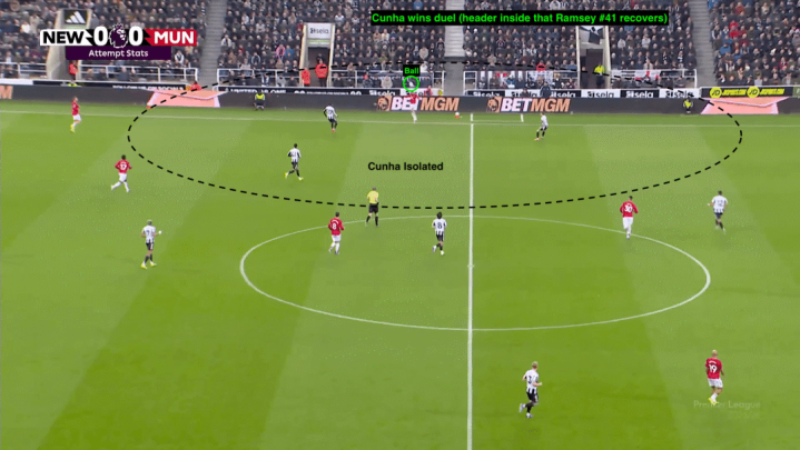 后半场间歇时间,库尼亚被安排回撤,并且到更靠左的身位带球。他成功场上疾走配合布鲁诺·费尔南德斯的直塞,博得了扳平足球赛事杯结果的足球运动员惩足球点球罚射。