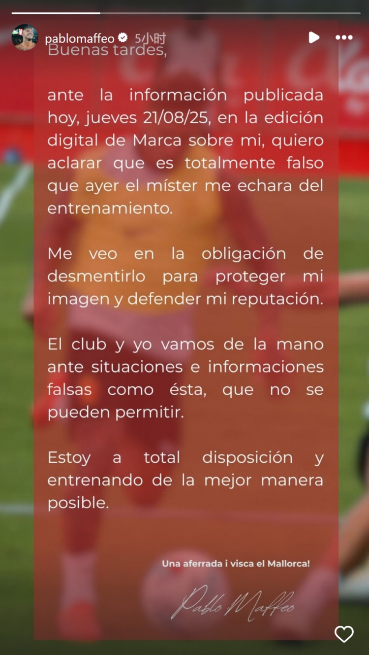 8月22日讯 马洛卡右后卫马菲奥更新社媒动态,否定我方被逐出考试的报说念。