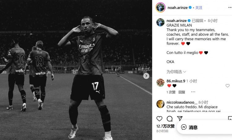 奥卡福写说念:“谢谢米兰!感谢我的队友、老到、使命主说念主员,尤其感谢球迷们。我将恒久留心这些回忆。❤️🖤”