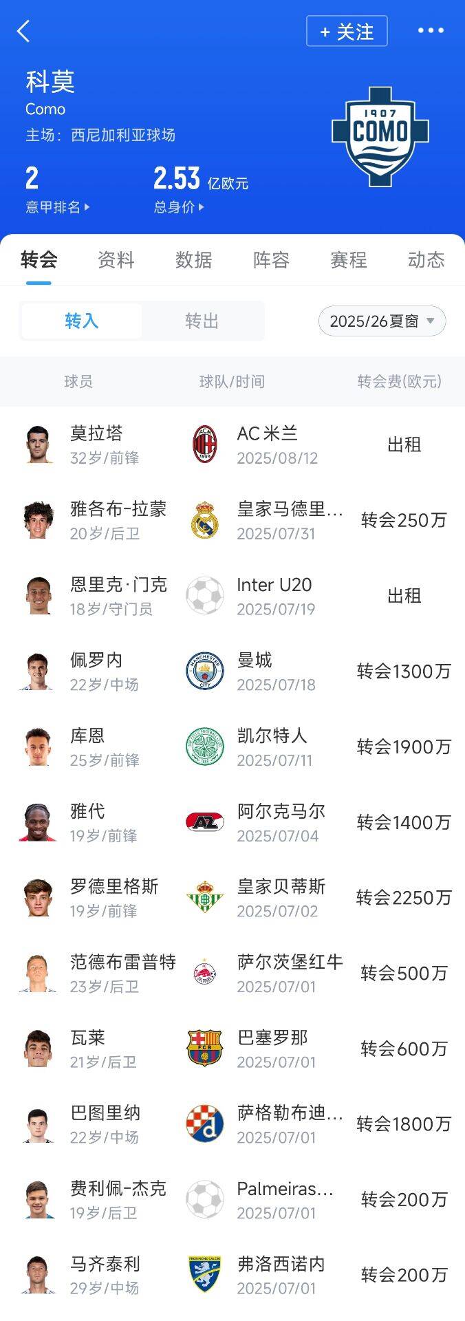 这个夏窗科莫破耗超1亿欧,引进了热苏斯-罗德里格斯、雅各布-拉蒙、佩罗内、库恩、巴图里纳等球员,转会费开销排阻碍甲前5。由此可见小法的球队贪心勃勃。