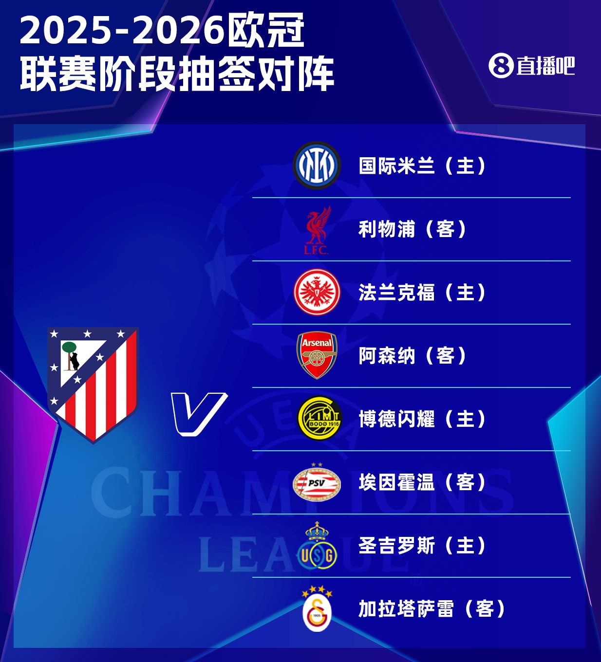 8月29日讯 25-26赛季欧冠联赛阶段抽签,马竞联赛阶段8支敌手出炉。