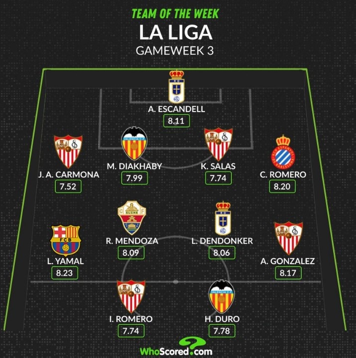 9月1日讯 本轮西甲战罢,数据网站Whoscored也评出本轮西甲最好阵,其中亚马尔领衔入选,具体如下: