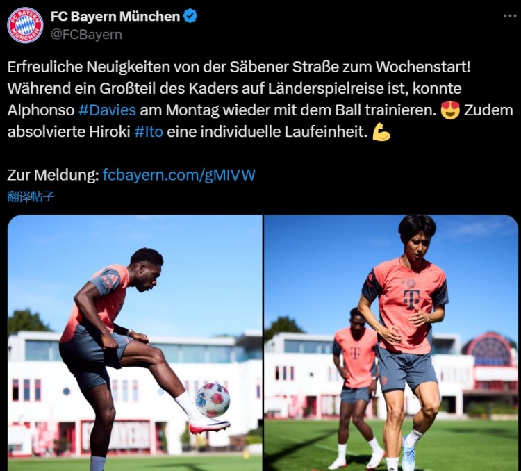 9月1日讯 拜仁官方告示,戴维斯复原有球检会,伊藤洋辉复原跑步检会。